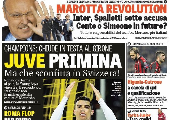 “Juve prima con i buchi”, questo invece il titolo di Tuttosport che in particolare si concentra sulla sconfitta dei bianconeri contro lo Young Boys. In taglio alto si legge si Torino e Milan, si spalla invece ecco l’Inter, il Napoli e Atalanta-Lazio.