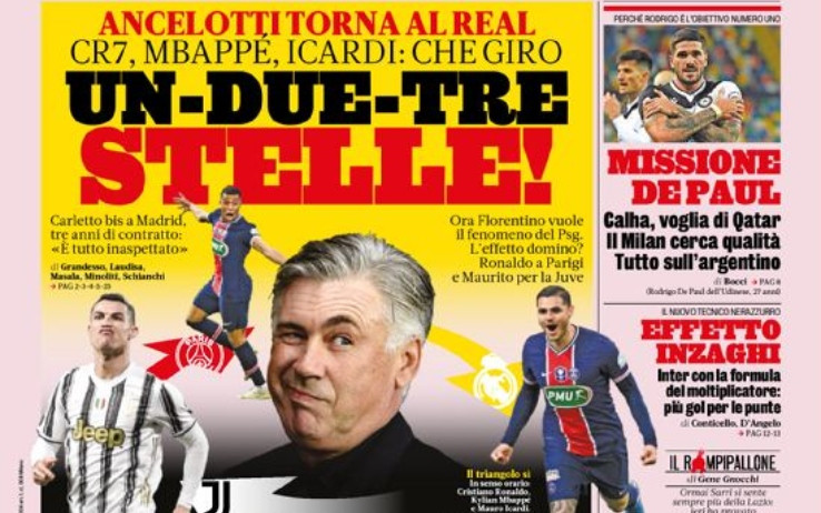 Dal ritorno di Ancelotti sulla panchina del Real Madrid alle convocazioni di Roberto Mancini per l’Europeo che inizierà l’11 giugno: questi i principali temi sulle prime pagine dei quotidiani sportivi (e non) in edicola oggi.
