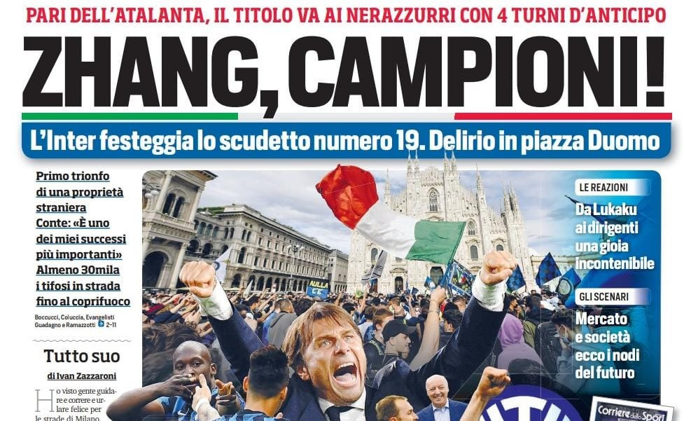Il 19esimo scudetto dell’Inter è la principale apertura delle prime pagine dei quotidiani sportivi in edicola oggi. Si legge poi anche del resto della giornata di Serie A che si concluderà stasera con il posticipo tra Torino e Parma.