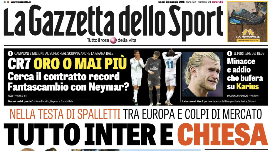 “Tutto Inter e Chiesa” titola invece la Gazzetta dello Sport, mentre nel trafiletto in alto parla di un possibile maxi-scambio tra CR7 e Neymar
