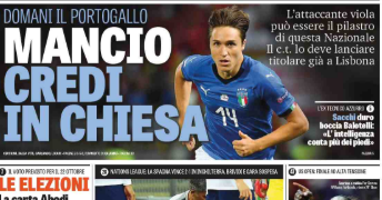 Il Corriere dello Sport titola con “Rifondiamo o affondiamo”, riferito al percorso della Nazionale di Roberto Mancini. Secondo il quotidiano lunedì sera contro il Portogallo l’attacco sarà affidato alla coppia Chiesa-Immobile.