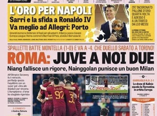 “Roma: Juve a noi due”: la Gazzetta dello Sport apre con il chiaro messaggio dei giallorossi al campionato. La squadra di Spalletti batte il Milan ed arriva al match dello Stadium a -4 dai bianoneri. “L’oro per Napoli”: spazio anche alla sfida tra gli azzurri e il Real Madrid di CR7, fresco vincitore del prestigioso premio.