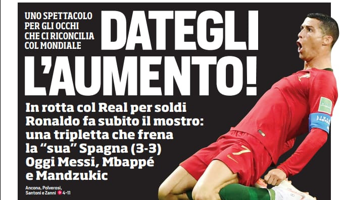 “Dategli l’aumento!” Apre così il Corriere dello Sport, con chiaro riferimento a Cristiano Ronaldo: “In rotta con il Real per soldi, fa subito il mostro: una tripletta che frena la sua Spagna” Si legge nel sommario. Taglio alto dedicato al Napoli: “Spaccaurelio” Si legge, con l’intervista esclusiva a De Laurentiis che parla di mercato. Taglio basso ancora sul mercato: “Milan, Higuain alla Bonucci. Ma l’ostacolo può essere Sarri” Con i rossoneri sempre alla ricerca di una grande punta.