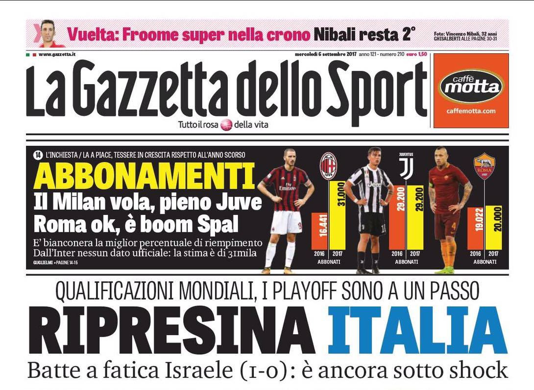 Serviva una vittoria ed è arrivata con Israele. Nonostante la prestazione non esaltante l’Italia ha ipotecato il passaggio al palyoff. E le prime pagine dei quotidiani sportivi sono naturalmente dedicate alla vittoria degli azzurri. Apre la rassegna il Corriere dello Sport che titola: “San Ciro”, rivolgendosi ad Immobile, autore del gol decisivo. Anche Tuttosport apre con l’Italia: “Eppur si muove”. Spazio anche al Torino: “Super Niang spaccherà”. Per La Gazzetta dello Sport è “ripresina Italia”: nonostante il faticoso 1-0, però, la Nazionale è “ancora sotto shock”. Nel taglio altro un bilancio sugli abbonamenti delle squadre di Serie A: “Il Milan vola, pieno Juventus, Roma ok, boom Spal”.