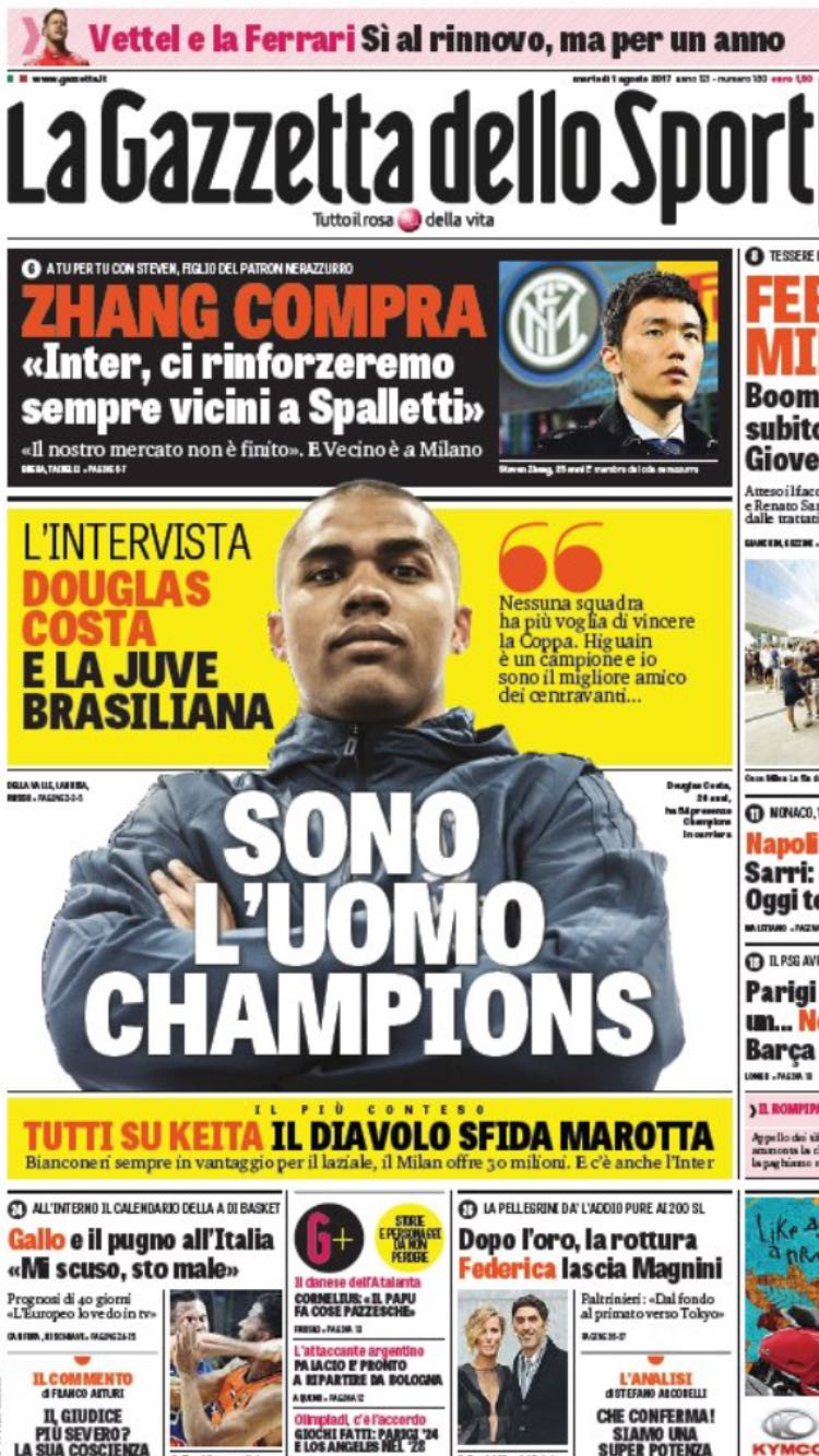 La Gazzetta dello Sport apre con un’intervista a Douglas Costa: “Sono l’Uomo Champions” – affera il brasiliano – nessuna squadra ha più voglia di vincere la Coppa”. In taglio alto ci sono le parole di Zhang, figlio del presidente dell’Inter: “Ci rinforzeremo, sempre più vicini a Spalletti”.
