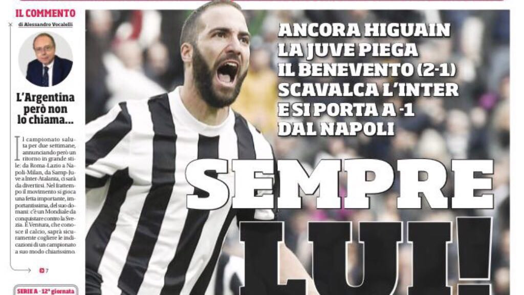 Il Corriere dello Sport dedica l’apertura a Higuain: “Sempre lui!”. “Grande Toro a San Siro; Eppur si gode” è l’apertura di Tuttosport.