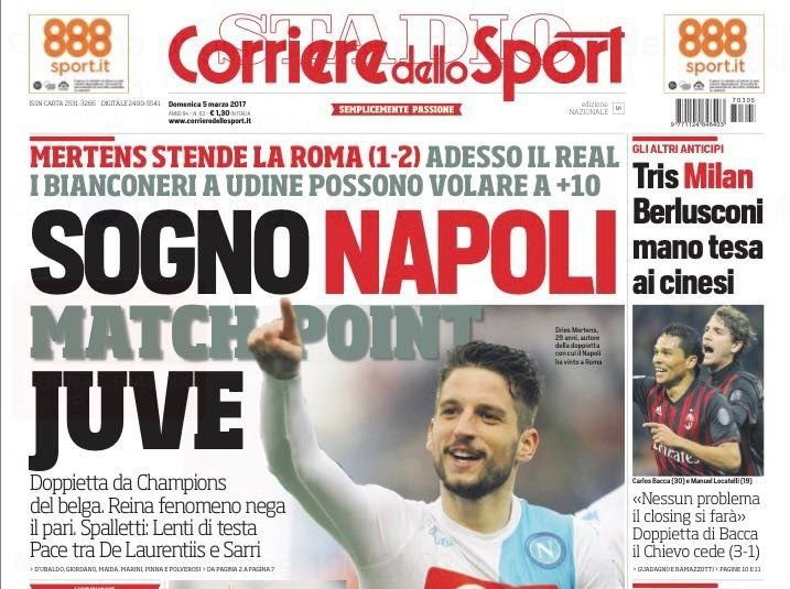 La ventisettesima giornata di Serie A si è aperta ieri, con i tre anticipi del sabato. Vittorie per Napoli, Samp e Milan, e all’Olimpico è stata una doppietta di Mertens a fermare la Roma, rimasta a 7 punti dalla Juventus che oggi affronterà l’Udinese. “Sogno Napoli”, questo il titolo sulla prima pagina del Corriere dello Sport: la squadra di Sarri batte la Roma con una doppietta di Mertens, regalando il match point scudetto alla Juventus. Di spalla, ecco il tris del Milan sul Chievo e Berlusconi sicuro sulla chiusura con i cinesi per la vendita del club. In taglio basso invece la Premier League: è “Gabbiadini show”, con l’italiano protagonista ancora con la maglia del Southampton e la bufera su Ibrahimovic che sbaglia il rigore nella partita contro il Bournemouth. ‘Juve, chiudila qui!”, questo invece il titolo sulla prima pagina di Tuttosport. In taglio alto poi si torna alla vittoria del Napoli grazie alla doppietta di Dries Mertens, mentre di spalla l’incitamento di Mihailovic: “Facciamo cantare il Gallo”. Infine, in taglio basso, il Milan diviso tra la certezza Bacca e i dubbi sul closing. Spazio anche alla Serie B: ‘Novara e Pro, colpi pesanti con vista derby’. “Un Napoli Real lancia la Juve” il titolo scelto in prima pagina da La Gazzetta dello Sport , con la particolarissima esultanza di Dries Mertens sullo sfondo. Spazio anche a un “Milan Sprint”: “Bacca-Lapadula, ciao Chievo: successo con vista Europa”. In basso alla prima pagina una frase estrapolata dalla conferenza stampa di Massimiliano Allegri: “Futuro? Parlerò con la società”.