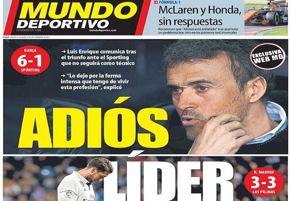 Su Sport è “Adios de Lider”: “Non rinnoverò il mio contratto – dice l’allenatore asturiano – e il motivo è nel modo in cui vivo questo lavoro”. E’ “Adios Lider” per l’altro giornale catalano, il Mundo Deportivo: il volto di Luis Enrique in taglio alto, la testa chinata in taglio basso di Sergio Ramos, con il Real adesso secondo, anche se la squadra di Zidane dovrà recuperare il match con il Celta Vigo.