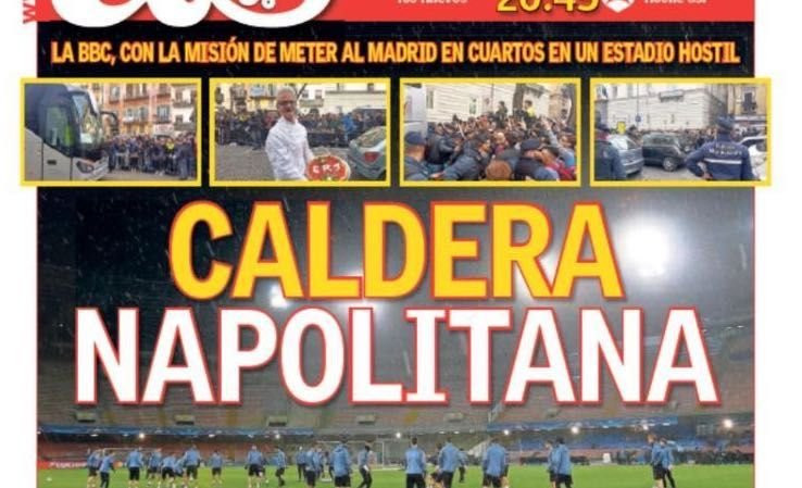 E’ finalmente arrivato il giorno di Napoli-Real Madrid. Una o l’altra andrà ai quarti di finale di Champions, con il Real Madrid favorito visto il 3-1 dell’andata. Ma con il calore e l’affetto del San Paolo tutto potrà succedere. Un aspetto, quello del San Paolo, toccato anche sulle prime pagine dei giornali spagnoli. A cominciare proprio dai giornali madrileni. Su Marca è “Apagad el Volcano”. Spegnete il vulcano: il Real si gioca la Champions contro un Napoli in eruzione. Sarà BBC in avanti per Zidane che dice: “L’importante è l’attitudine, non la tattica”. Su AS è “Caldera Napolitana”. In taglio basso spazio anche alle parole di Hamsik che ammette: “I nostri tifosi si sentiranno fino a Torino”. Un Napoli in funzione remontada, che accompagna anche il Barcellona, che domani affronterà il PSG per riscattare lo 0-4 di Parigi. E sui giornali catalani c’è ovviamente la squadra di Luis Enrique in apertura, ma c’è spazio anche per Napoli- Real-Madrid. Su Sport: “Un inferno aspetta il Real”. E sul Mundo Deportivo non siamo poi così distanti: “L’Inferno del San Paolo contro la BBC”.