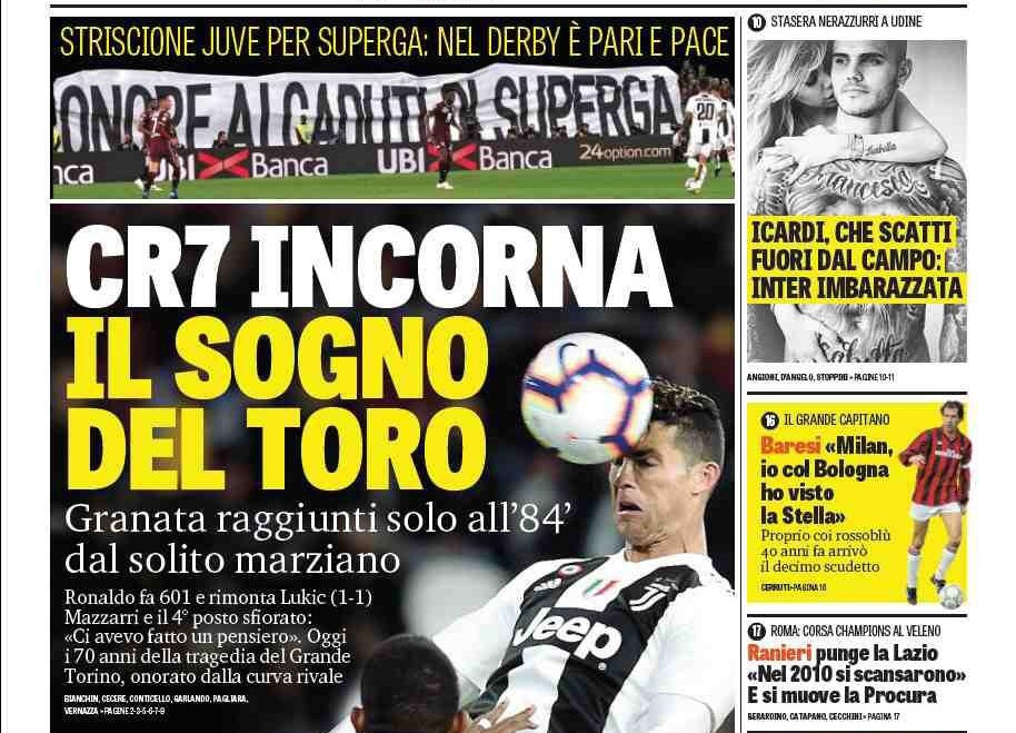 Spazio al derby di Torino e non solo sulle prime pagine dei quotidiani sportivi in edicola. Dalla rete di Cristiano Ronaldo alla volata Champions, in cui i granata saranno protagonisti fino all'ultima giornata. Poi il ricordo del Grande Torino, le parole di Ranieri e Spalletti. SFOGLIA LA FOTOGALLERY IN ALTO.