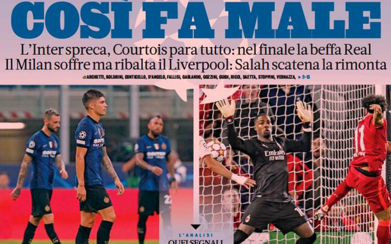 Le sconfitte di Milan ed Inter in primo piano sulle prime pagine dei quotidiani sportivi italiani. Stasera tocca alle italiane impegnate in Europa League e alla Roma di Josè Mourinho nel debutto assoluto in Conference League.