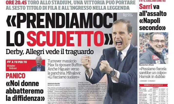 Il Corriere dello Sport titola con un virgolettato di Allegri: “Prendiamoci lo scudetto”. In taglio alto invece spazio alla vicenda Muntari, espulso nella partita con il Cagliari dopo aver abbandonato il campo a seguito di alcuni cori razzisti nei suoi confronti: “Giustizia è fatta”, secondo il Corriere in relazione al ricorso accolto che di fatto rimuove la squalifica al giocatore del Pescara. C’è spazio anche per le parole di Sarri, alla ricerca dell’aggancio alla Roma: “Napoli secondo”.