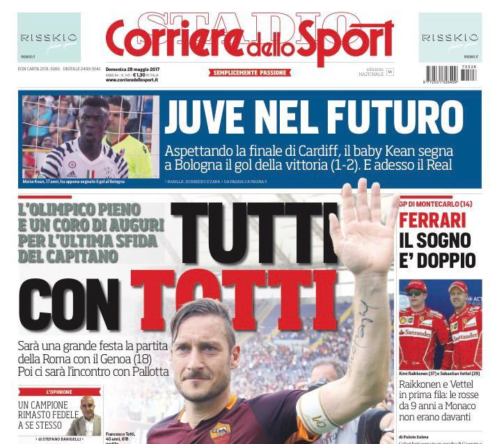 “Tutti con Totti” è il titolo del Corriere dello Sport che celebra così la grande festa che ci sarà oggi all’Olimpico, in un coro di auguri per l’ultima sfida del Capitano. Taglio alto dedicato alla Juventus che vince a Bologna: “Juve nel futuro”, aspettando la finale di Cardiff, il baby Kean segna a Bologna il gol vittoria. Taglio basso per il calciomercato con “asta per Donnarumma, spunta anche il Napoli”. Tuttosport apre la prima pagina con la vittoria della Juventus a Bologna: “Kean il futuro è Juve”. I bianconeri chiudono la rimonta con i gol di Dybala e del baby bomber. Spalla dedicata a Torino con “Miha in stile Giagnoni. Con il Sassuolo per un saluto da applausi”. Taglio basso riservato al calciomercato e un’idea lanciata dal giornale torinese: “Napoli, idea Donnarumma”. Sempre in basso si parla di Roma con “Rudiger e Nainggolan su cui l’Inter mette 70 milioni”.