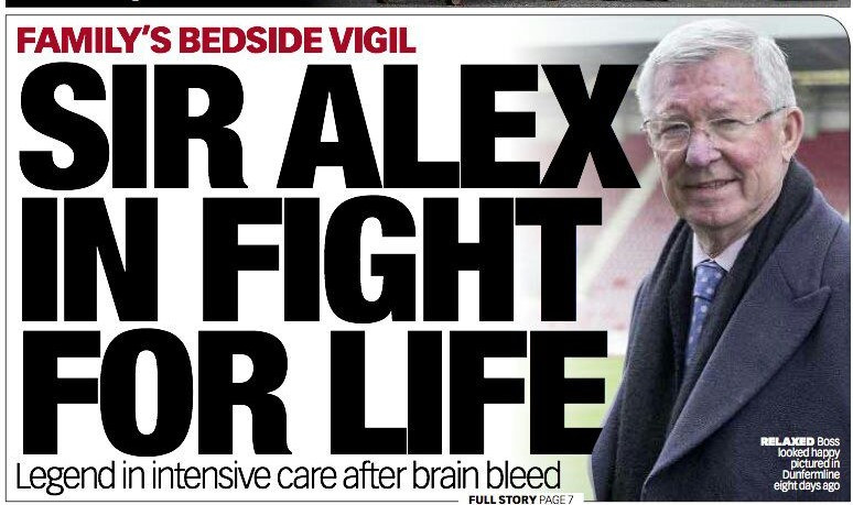 Le prime pagine dei quotidiani inglesi sportivi sono tutte per Sir Alex Ferguson. L’ex manager del Manchester United ieri è stato operato d’urgenza per un’emorragia cerebrale: la notizia presto ha fatto il giro del mondo ed oggi le prime d’oltremanica sono tornate sull’argomento, spiegando la situazione, dal fatto che adesso Ferguson sia in terapia intensiva e che stia lottando per vivere.