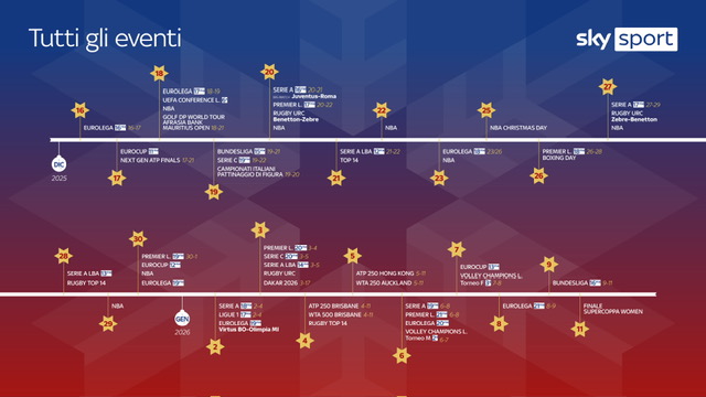 Sky Casa dello Sport, ma anche Casa del Basket, soprattutto a Natale: per l’intero periodo delle feste si scenderà in campo praticamente tutti i giorni per un totale di oltre 50 match tra Eurolega ed Eurocup in esclusiva, Serie A LBA e gli appuntamenti NBA, compreso l’attesissimo Xmas Day del giorno di Natale. Non mancheranno il tennis, che chiuderà un altro anno straordinario con le Next Gen ATP Finals a Jeddah da oggi al 21 dicembre, e i motori con una novità: Sky sarà official broadcaster della Dakar 2026, al via il 3 gennaio. E ancora, gli appuntamenti con rugby, golf, volley e tanto altro.
