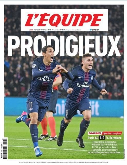 Prodigioso. Anzi: “Prodigieux” alla francese perché francese è la squadra del momento, in Europa. Tre lettere: PSG. Quattro gol al grande piccolo Barcellona, naufragato sotto la Tour Eiffel. La prima pagina dell’Equipe non fa troppi giri – né giochi – di parole e va dritta al sodo fotografando la serata perfetta dei ragazzi di Emery in un’immagine: Di Maria che mima il cuore per il suo amore nei confronti di un calcio formato poesia, proprio nel giorno di San Valentino. Ah, altro piccolo dettaglio della serata, anzi del giorno dopo: ‘el Fideo’ argentino ha poi festeggiato il suo 29esimo compleanno allo scoccare della mezzanotte in compagnia di molti suoi compagni di squadra. Edinson Cavani – anche lui in gol, anche lui più grande di un anno alle 00.00 del 15 febbraio – nel frattempo ne aveva organizzata un’altra, concorrente, ma solo con parenti stretti. E pensate che quest’incredibile coincidenza – compleanno con gol in Champions – era successo anche a Julio Baptista e Mirko Vucinic, nel lontano 1 ottobre del 2008 con la maglia della Roma.
