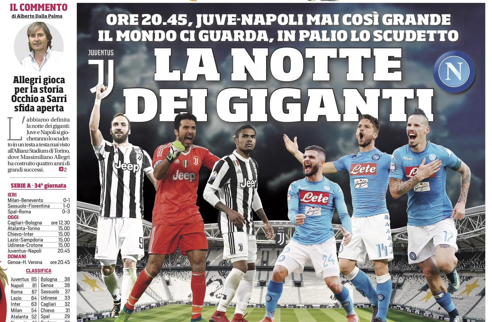 “Il colpaccio della Strega” è il titolo scelto da Il Sannio per celebrare il successo della squadra di De Zerbi a San Siro, mentre Il Mattino apre con “Ora o mai più: stasera la partitissima scudetto a Torino; Martens favorito su Milik, Sarri va a Superga e Allegri punge: ‘Conta di più per loro’”. L’Unione Sarda si concentra sulla gara dei rossoblù di Diego Lopez: “Sardegna Arena, mezzogiorno di fuoco. Con il Bologna il Cagliari si gioca la Serie A”.