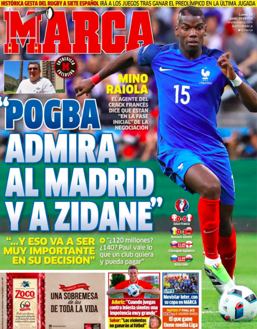 Lo fa il suo agente che in esclusiva su Marca conferma: “Pogba ammira il Real e Zidane e questo sarà molto importante per la sua decisione finale sul suo futuro”. E ancora ammette come le parti siano “nella fase iniziale della trattativa”. Come da noi raccolto nelle ultime settimane, un primo contatto Raiola-Real c’è stato ma la differenza economica era ancora da colmare. E domani l’intervista completa di Raiola su Marca. Con Pogba al centro dell’Europeo… e del mercato.