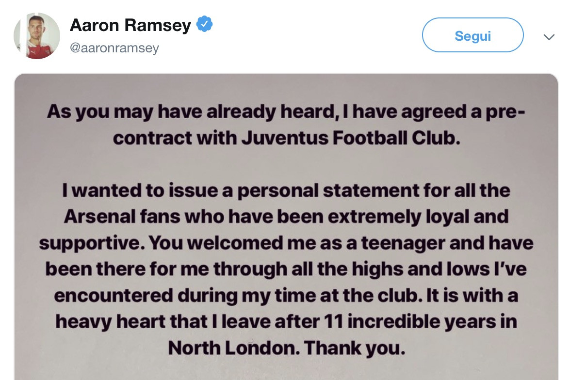 “Come avrete sentito” scrive su Twitter il giocatore, “ho firmato un precontratto con la Juventus. Volevo però dire una cosa a tutti i tifosi dell’Arsenal che mi hanno sempre sostenuto: mi avete accolto da ragazzo e mi avete sempre sostenuto negli alti e nei bassi. Sono stati 11 anni incredibili qui, grazie“, le sue parole. Sentite, sincere: i tifosi lo stanno salutando sui social per quanto ha fatto con la maglia dei Gunners. Quelli della Juve non vedono l’ora di abbracciarlo. Potranno farlo da giugno.