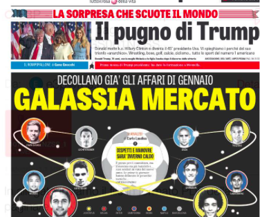 Il ‘Corriere dello Sport’ invece sottopone alla lente d’ingrandimento l’allarme infortuni in Serie A: “193 infortunati in A: si rompono tutti”. Spazio anche alla Nazionale: gli esperimenti di Ventura “È un’Italia unica al mondo” e gli azzurrini “Under d’oro: il valore è salito a 270 milioni”. Ed ovviamente il mercato: “I giovani di Gasp nel mirino della Juve”; “Inter, per Pioli subito Darmian”; “La Roma a Spalletti: ‘Pronto il rinnovo’”.