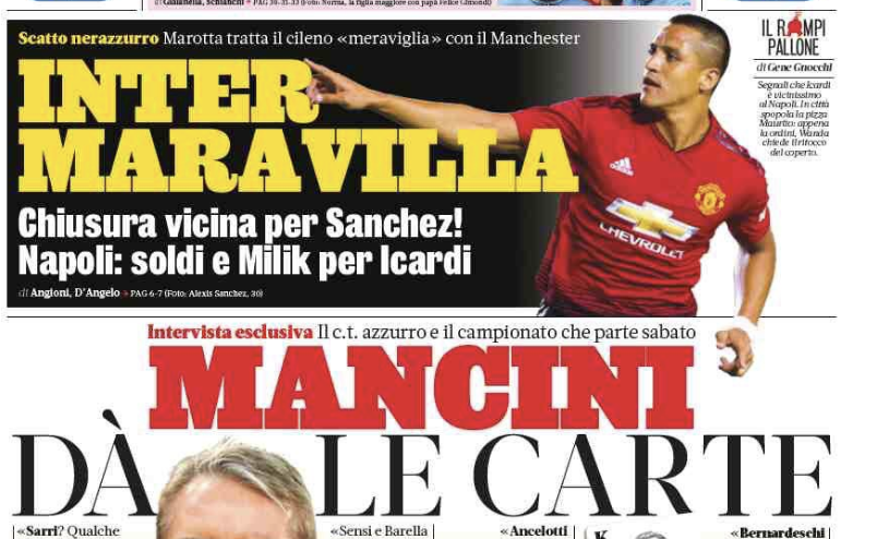Dall'Euro-Gol di Dybala nell'ultima amichevole pre campionato della Juventus a Trieste fino al "flop" della campagna abbonamenti del Napoli. Passando per il calciomercato. Il valzer delle punte entra sempre più nel vivo: Icardi, Milik, Dybala. Questo e molto altro nelle prime pagine sportive (e non) in edicola oggi.