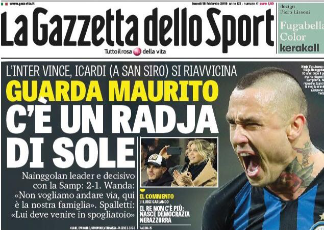 “Guarda Maurito, un Radja di sole”, titola La Gazzetta dello Sport, con il centrocampista leader che mette la Samp ko. Elogi per Piatek – “Un po’ di Sheva, Ibra, Van Basten e Inzaghi. Piatek, che super mix!” -, spazio anche per il commento delle partite di ieri: “La Var annulla la SPAL e lancia la Fiorentina”, “Stop Napoli, la Juve fa +13, Toro granitico: l’Europa è lì”.