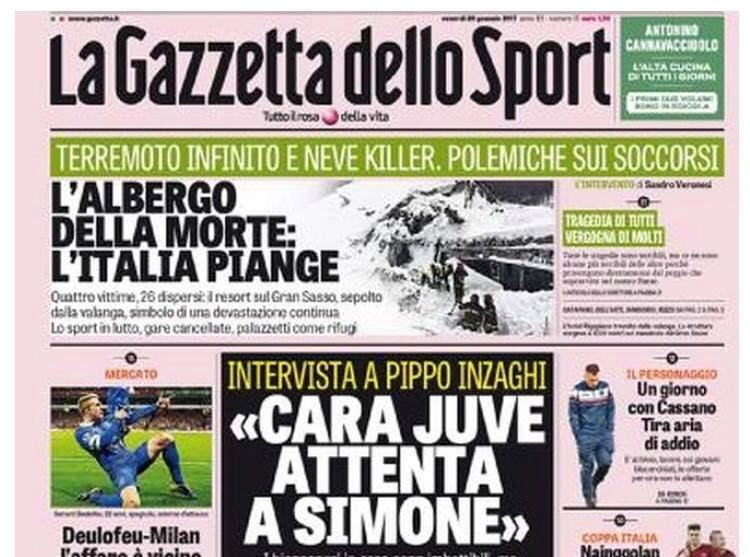 ‘La Gazzetta dello Sport’ fa un’eccezione e dedica la propria prima pagina con l’intervista a Pippo Inzaghi: “Cara Juve attenta a Simone”. Ma si torna subito al mercato: “Deulofeu-Milan: l’affare è vicino. E per giugno l’idea Gabbiadini”. Infine “Un giorno con Cassano: tira aria di addio” e “Nainggolan scatenato: la Roma ne fa 4 e vola ai quarti”.