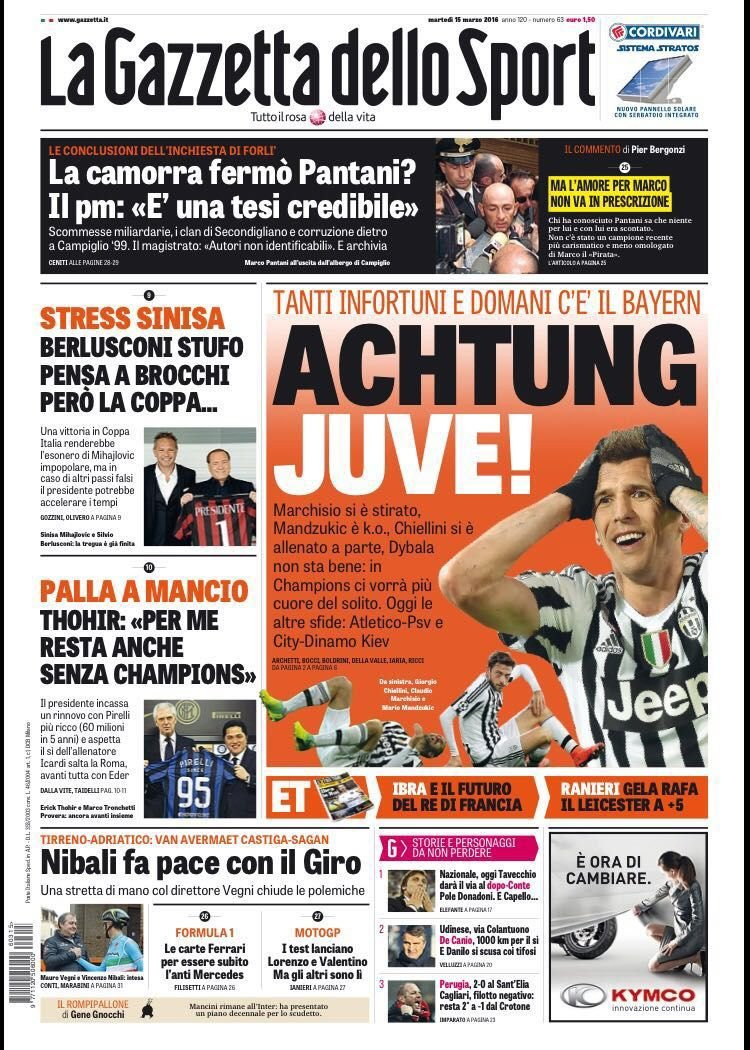 Riparte al Champions League, la Juventus tenta l’impresa in casa del Bayern Monaco dopo il due pari in rimonta dell’andata a Torino. I principali quotidiani sportivi italiani dedicano l’apertura proprio alla Juve in vista della partita di mercoledì.