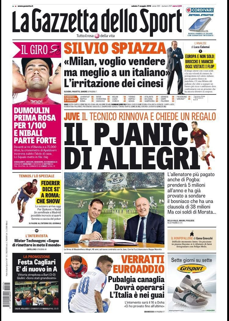 La Gazzetta dello Sport dedica la prima pagina al rinnovo con la Juventus fino al 2018 di Massimiliano Allegri: “Il Pjanic di Allegri”. Il bosniaco infatti, nonostante la clausola di 38 milioni, sarebbe il regalo chiesto da Max alla dirigenza bianconera. Spazio anche per le parole di Berlusconi che spiazza un po’ tutti e irrita i cinesi: “Voglio vendere, ma meglio a un italiano”. E poi una brutta notizia per Antonio Conte: “Verratti euroaddio.” Il centrocampista del PSG dovrà operarsi a causa della pubalgia.