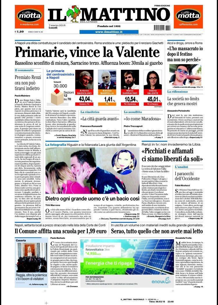 Altro fine settimana archiviato, altre partite giocate. In Serie A le prime tre della classe non sbagliano, vincono tutte dalla Juve alla Roma passando per il Napoli, tornato a conquistare i tre punti. Ha segnato ancora Gonzalo Higuain protagonista di un tenero momento a fine partita. Sulla prima pagina de Il Mattino campeggia una foto in cui il Pipita è stato immortalato mentre bacia la fidanzata Lara, arrivata dall’Argentina. “Dietro ogni grande uomo c’è un bacio così”, veloce ma non per questo poco passionale. E se Higuain festeggia così, Sarri si consola non solo perchè il distacco dalla Juventus è rimasto invariato ma anche perchè il calendario sembra essere più favorevole agli azzurri: “La Juve torna a +3 ma il Napoli confida nel calendario”, titola così in apertura il quotidiano Il Roma, in taglio alto riservato allo sport.