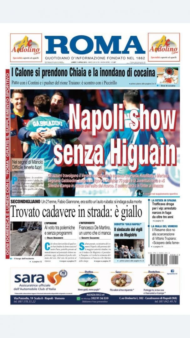 La vittoria della Lazio è ripresa anche dal Quotidiano romano ‘Il Tempo‘ che, oltre a esaltare Simone Inzaghi capace di “rialzare la Lazio e sognare l’Europa”, riporta la notizia di alcuni scontri avvenuti nel pre partita tra tifosi palermitani e laziali, definendoli “I soliti idioti”. L’attenzione del ‘Mattino‘ si concentra sul Napoli, trascinato da un “Gabbiadini show”. L’attaccante italiano non fa rimpiangere Higuain e apre le marcature nella sfida contro l’Hellas Verona che regala i tre punti agli azzurri e li lascia in scia della Juventus. Anche la prima del ‘Roma‘ mette in risalto le gesta degli uomini di Sarri, titolando con un “Napoli show senza Higuain”, accennando anche al silenzio stampa messo in atto dalla società di De Laurentiis in attesa del ricorso contro la squalifica del ‘Pipita. La ‘Nazione‘ sposta l’attenzione sul derby toscano, dove si legge di una “Fiorentina choc, sconfitta nettamente dall’Empoli”. Il futuro di Paulo Sousa non è in bilico, ed è lo stesso allenatore portoghese che spazza via ogni dubbio “Resto a Firenze l’anno prossimo”.