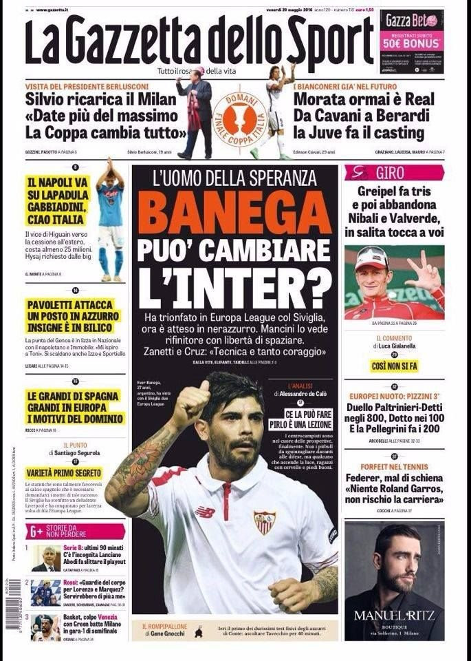 “Banega può cambiare l’Inter?” è l’apertura de La Gazzetta dello Sport. Focus sul centrocampista argentino, protagonista nella grande vittoria del Siviglia contro il Liverpool. Mancini lo vede già rifinitore, Zanetti e Cruz lo elogiano: “Tecnica e tanto coraggio”. Anche il Corriere dello Sport si concentra sul calciatore della squadra andalusa: “Banega accende l’Inter” il titolo del quotidiano romano, che sottolinea l’entusiasmo dell’allenatore nerazzurro per l’arrivo dell’ex Boca Juniors: “Saremo da scudetto”. In taglio alto, infine, spazio alle parole di Berlusconi (“Dai Milan regalami l’Europa”) e Pogba (“Dai Juve alziamo la Coppa”) a pochi giorni dalla finale di Roma. Lo stesso fuoriclasse francese è il protagonista della prima pagina di Tuttosport: “Champions? La vinco qui” la promessa del numero 10 bianconero, desideroso di trionfare in Europa con la maglia della Juventus. In ottica mercato, invece, si cerca il terzino destro da regalare ad Allegri: tra Danilo e De Sciglio, spunta Matteo Darmian.