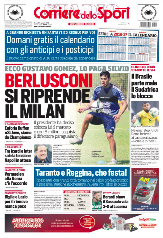 “Berlusconi si riprende il Milan” è invece l’apertura del “Corriere dello Sport”: il presidente rossonero ha deciso di sbloccare il mercato del Milan acquistando, per 8 milioni, il difensore paraguaiano Gustavo Gomez. Di spalla spazio alla ‘prima’ del Brasile alle Olimpiadi di Rio, che parte male pareggiando 0-0 contro il Sudafrica.
