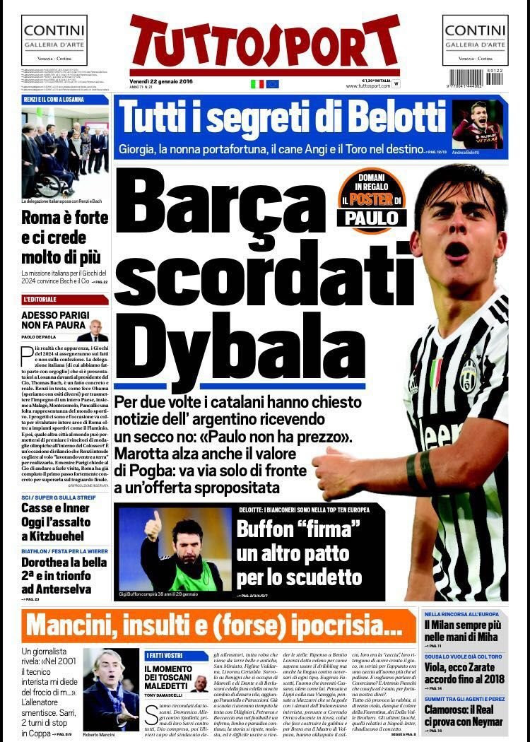 “Barça scordati Dybala” è la prima pagina di Tuttosport. Per due volte i catalani hanno chiesto notizie dell’argentino ricevendo un secco no mentre Marotta alza anche il valore di Pogba: andrebbe via dalla Juventus solo con un’offerta spropositata. Il taglio alto “Tutti i segreti di Belotti” è dedicato al magic moment dell’attaccante granata che ha segnato tre reti nelle ultime due partite. Tante altre notizie sul weekend di serie A che sta arrivando, calcio estero, curiosità e soprattutto tanto calciomercato. Ecco la rassegna stampa. Dove? Ovviamente qui…su GianlucaDiMarzio.com…
