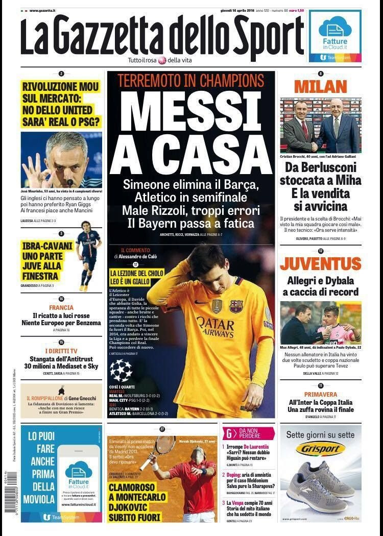 “Messi a casa” è l’apertura de La Gazzetta dello Sport. Impresa Atletico a Madrid, Barcellona a casa. In spalla, domina il mercato. Il no dello United a Mou rimescola le carte: per il portoghese sarà Real o Psg? Proprio da Parigi partirà uno tra Ibra e Cavani: Juventus alla finestra.