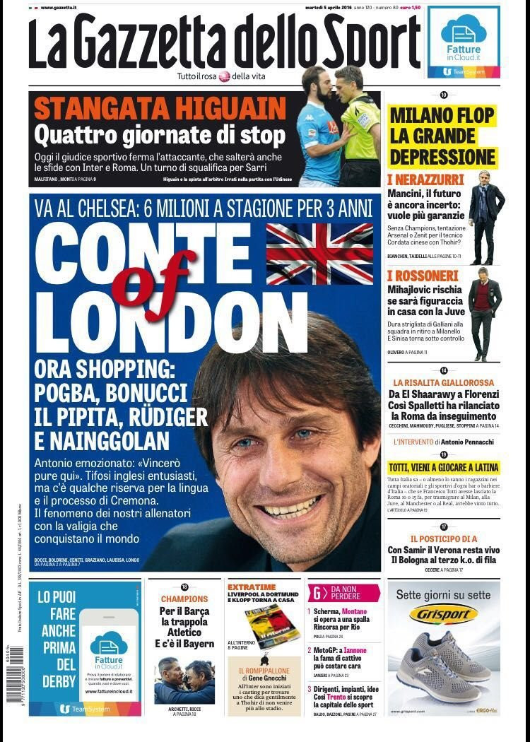 Antonio Conte al Chelsea la prossima estate, Gonzalo Higuain alle prese con una possibile maxi squalifica, Simone Inzaghi pronto ad iniziare la sua avventura sulla panchina della Lazio. Questo ed altro sulle prime pagine dei quotidiani domani in edicola, a partire dal “Conte of London” scelto della Gazzetta dello Sport, che annuncia i primi obiettivi dell’attuale CT dell’Italia quando sbarcherà a Londra. Pogba, Bonucci, Higuain, Rudiger e Nainggolan per un mercato davvero incredibile. Spalla dedicata al flop delle milanesi e “la grande depressione” con il futuro incerto di Mancini e Mihajlovic.