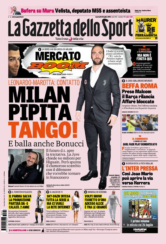 La Gazzetta dello Sport apre in prima pagina con l’affare Higuain-Milan: “Higuanì. Il Pipita ora detta le condizioni. Chiede alla Juve di essere ceduto a titolo definitivo e vuole dal Milan un ingaggio da 9 milioni l’anno”. Spazio anche al mercato dell’Inter: “Ecco Vrsaljko, Vidal quasi ok, sogno Modric“. In taglio basso anche le vicende societarie del Bari: “Il Bari è di De Laurentiis”.