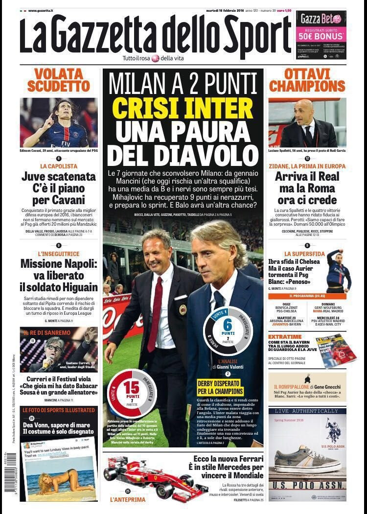 “Crisi Inter una paura del diavolo” è l’apertura de La Gazzetta dello Sport. Milan dietro di soli due punti, momento difficile in casa Inter. Nelle ultime 7 giornate per i nerazzurri rendimento da B, nervi sempre più tesi. I rossoneri, invece, hanno recuperato 9 punti ai cugini e adesso sono pronti allo sprint.