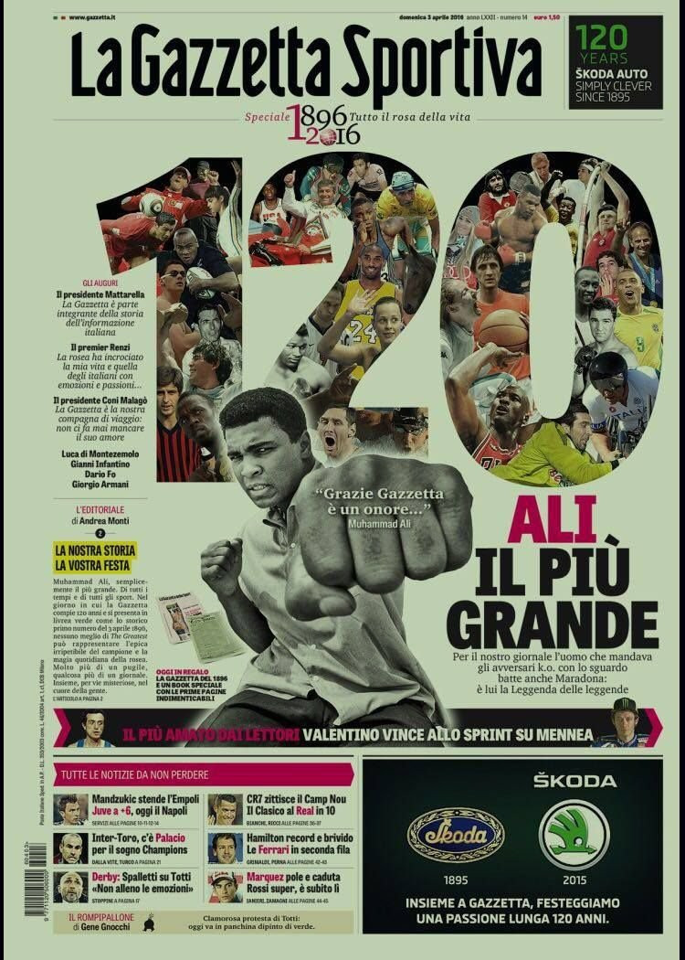 Ma le sorprese non finiscono qui perché sarà annunciato anche il campione assoluto, ovvero la ‘Leggenda delle leggende’ che sarà scelto attraverso un cartellone di sfide impossibili tra atleti di tutti gli sport di tutti i tempi: dal calcio al ciclismo, dal basket alla pallavolo, dalla Formula Uno allo sci e tanti altri sport. Il meglio del meglio dello sport mondiale dove 192 atleti sono diventati 16 e che adesso si giocano la finale in due: Diego Armando Maradona e Muhammad Ali che sono stati scelti dalla redazione de La Gazzetta dello Sport. Diverso, invece, il risultato del gioco, proposto online ai lettori, che hanno portato in finale Pietro Mennea e Valentino Rossi. Inoltre, il quotidiano avrà allegato anche uno speciale di ben 48 pagine dedicato agli ultimi 120 anni di sport, rivisitati attraverso le prime pagine di Gazzetta che ne hanno celebrato i momenti salienti e i campioni più celebri. Anche la home page di Gazzetta.it sarà di colore verde e persino lo screenshot sarà un pezzo più unico che raro.
