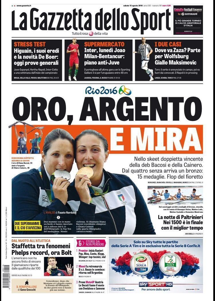 La Gazzetta dello Sport apre con il mercato. Joao Mario si avvicina all’Inter, mentre il Milan ha un piano per beffare la Juventus nella corsa a Bentancur. Due casi poi a Torino: Zaza vola in Germania per valutare l’offerta del Wolfsburg, Maksimovic invece non viene convocato per la partita di Coppa Italia.