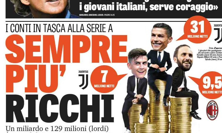 Serie A in pausa, è iniziata la settimana delle nazionali, con l’Italia di Roberto Mancini impegnata venerdì sera. Di questo, ma anche dei temi che ha lasciato in eredità l’ultima giornata di campionato si parla sulle prime pagine dei quotidiani sportivi e non solo. “Sempre più ricchi”, il titolo principale della Gazzetta dello Sport che fa “i conti in tasca alla Serie A. Un miliardo e 129 milioni (lordi). E’ record di ingaggi per i giocatori. L’effetto Ronaldo si fa sentire, dopo di lui Higuain e Dybala. Allenatori: al vertice resta Allegri”. Nel taglio alto spazio alle vicende azzurre: “Appello Nazionale. Mancini ai colleghi: ‘Fate giocare i giovani italiani, serve coraggio”. Nel box in basso: “Messi e la Champions: ‘Juventus favorita’”; “Marchisio ha scelto, va in Russia: Zenit”; “Squinzi: “Boa super. De Zerbi sembra DiFra”.