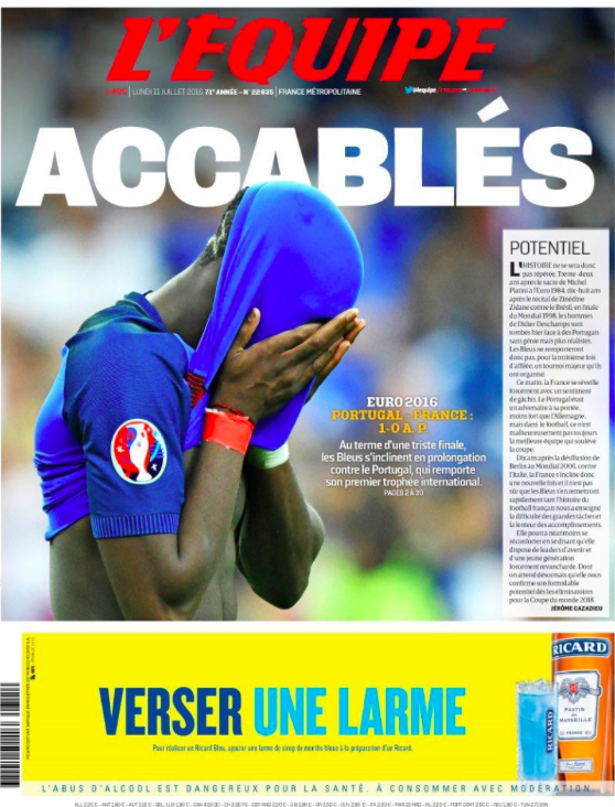 Liberatión invece apre con Griezmann con le mani nei capelli, lui che in questa stagione ha perso addirittura due finali: “Come dei blu”, è il titolo della prima pagina, dove si spiega che, seppur a fronte dell’uscita dal campo precoce di CR7, la Francia è stata sconfitta ai supplementari. Infine, “Non era il nostro giorno” è l’apertura de Le Parisien. Niente giri di parole, solamente l’immagine del Portogallo che alza la coppa col suo capitano Cristiano Ronaldo esultante ed ampiamente fasciato all’altezza del ginocchio. E la Francia con la testa china.