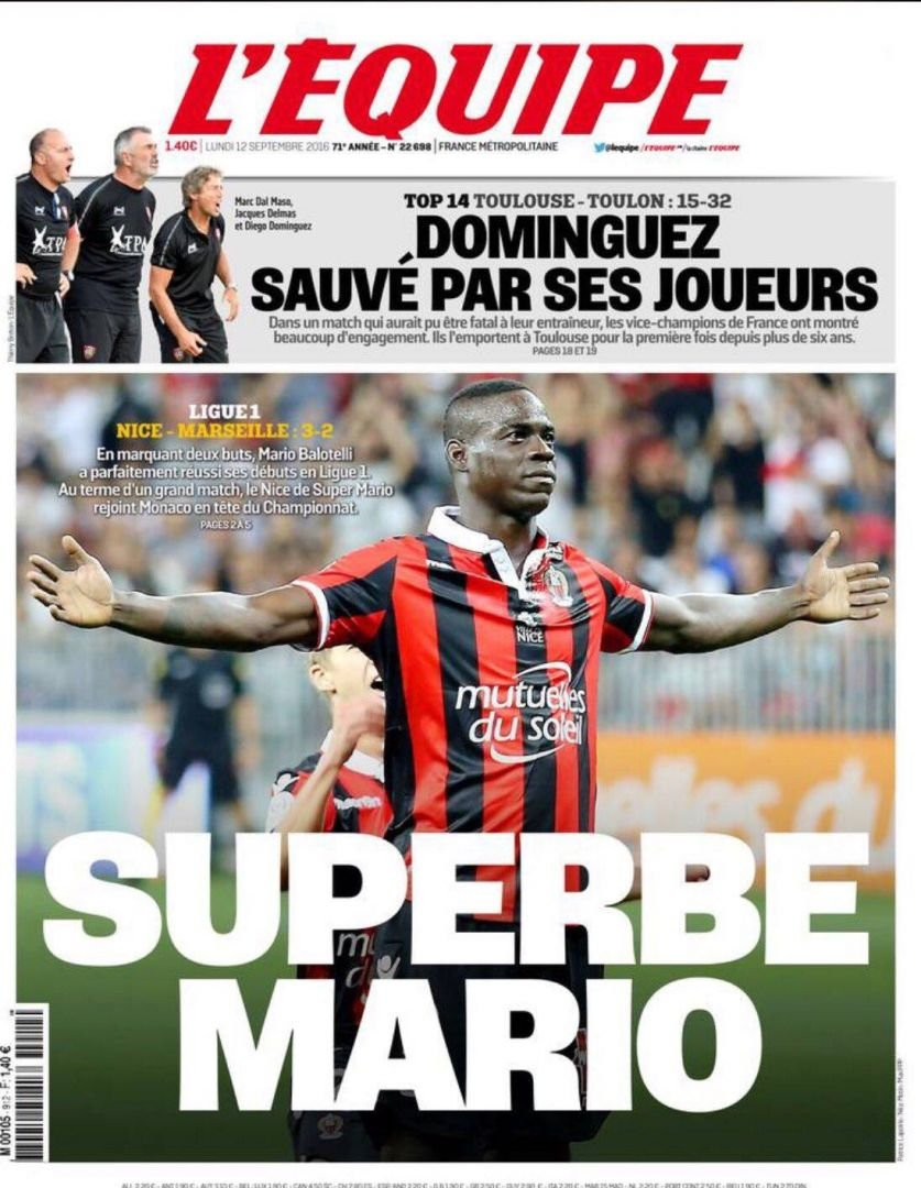 Esordio con gol. Due gol. Nel bene o nel male Balotelli riesce sempre a far parlare di sé. I tifosi francesi sono già pazzi di Super Mario, che ieri con la sua doppietta è riuscito a far sì che il Nizza trionfasse nel derby col Marsiglia. Ed oggi i titoli dei giornali francesi sono tutti per lui: “Superbo Mario” è l’apertura dell’Equipe, con tanto di foto di Balotelli esultante con le braccia allargate. Scorrendo il giornale poi un’intera pagina dedicata all’italiano col titolo “Mario il conquistatore”. Come inizio davvero niente male. Balotelli esordisce con due gol: in Francia non si parla d’altro.