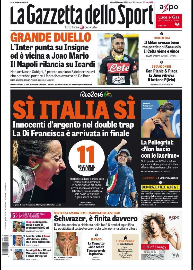 “Grande Duello” è l’apertura della Gazzzetta dello Sport, che spiega come l’Inter punti su Insigne ed sia vicina a Joao Mario, mentre il Napoli rilancia su Icardi. Nel caso non arrivasse Gabigol è pronto un piano B dei nerazzurri che potrebbe portare il fantasista del Napoli da De Boer.