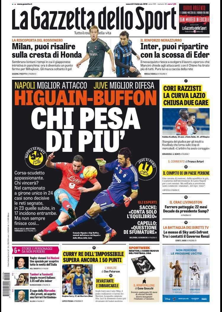 Venerdì 5 febbraio, un venerdì di vigilia per una nuova giornata di Serie A che si preannuncia scoppiettante. Napoli e Juventus dominano le prime pagine, a partire da La Gazzetta dello Sport che titola “Higuain-Buffon, chi pesa di più”. Il quotidiano milanese mette a confronto il miglior attacco (del Napoli), capeggiato da Higuain, con la miglior difesa (la Juventus), capitanata da Buffon. In taglio alto un’analisi sulle milanesi: ” Milan, puoi risalire sulla cresta di Honda”, “Inter, puoi ripartire con la scossa di Eder”.