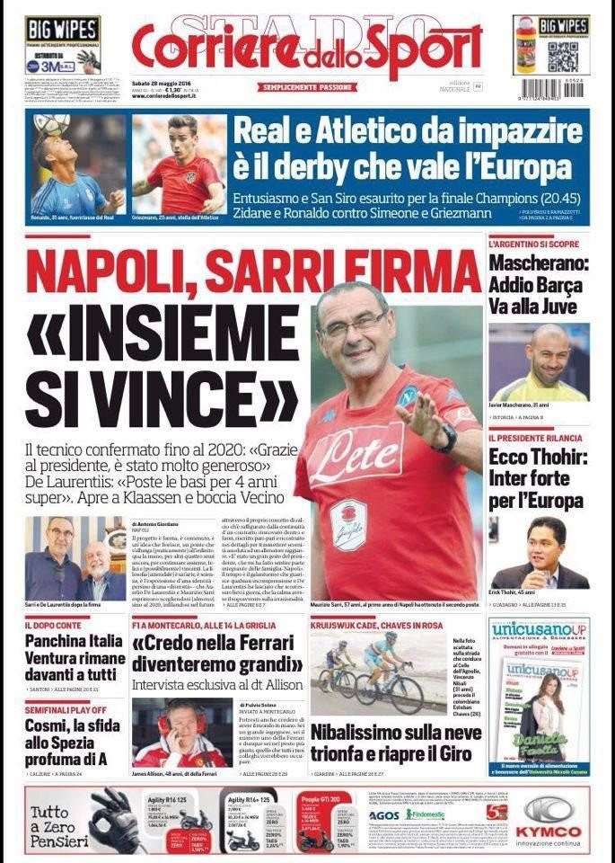 “Insieme si vince” è l’apertura del Corriere dello Sport. Maurizio Sarri firma il rinnovo del contratto con il Napoli, per l’allenatore toscano rinnovo fino al 2020. “Poste le basi per 4 anni super” le parole di un’entusiasta De Laurentiis. In chiave mercato, intanto, il presidente azzurro apre a Klaassen e boccia Vecino.