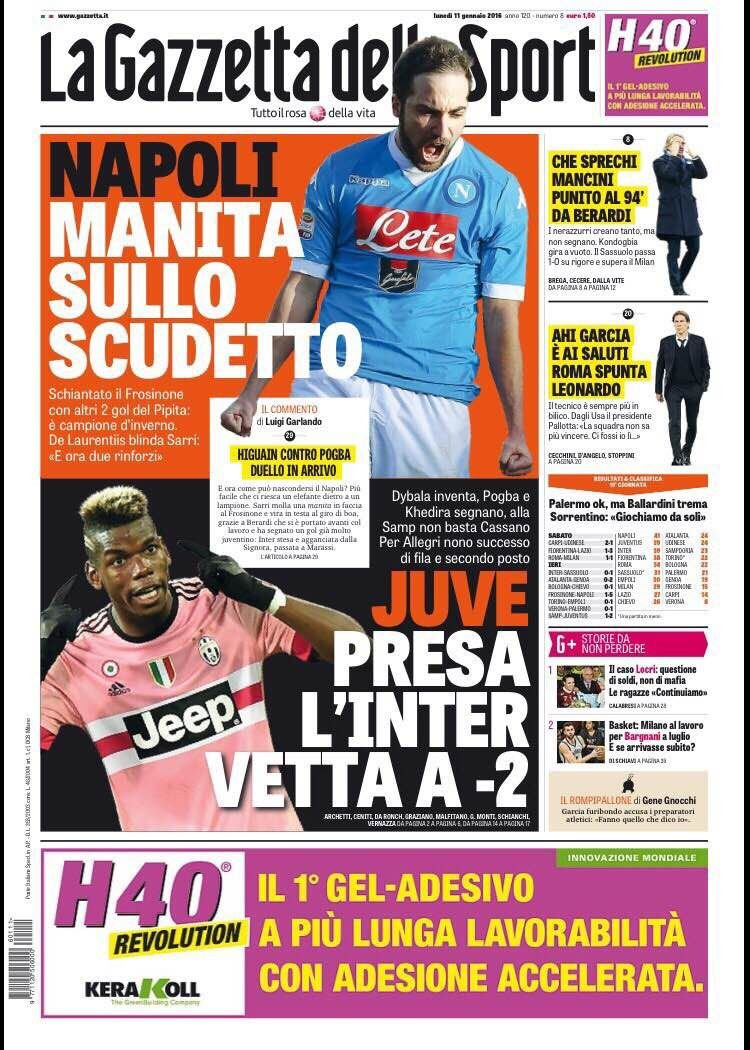 Ma andiamo a scoprire le prime pagine. “Napoli Campione d’inverno“: è semplice e diretto il titolo del Corriere dello Sport, che si sofferma sul successo della squadra di Sarri che è valso il primo posto in classifica al giro di boa del campionato. In taglio alto spazio alla sconfitta dell’Inter, battuta da un rigore di Berardi al 95′ dopo aver sprecato diverse occasioni; e alla vittoria della Juventus, inesorabile di fronte alla Sampdoria nonostante un ottimo Cassano.