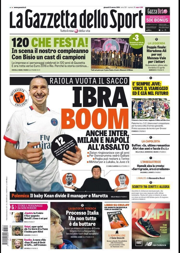 “Ibra Boom”, titola La Gazzetta dello Sport, con Inter, Milan e Napoli all’assalto dell’attaccante svedese che “ringiovanisce con gli anni”, secondo quanto affermato dall’agente dello svedese, Mino Raiola, pronto a trattare anche i temi relativi a Donnarumma e Pogba. Taglio alto dedicato, invece, ai 120 anni di storia della “Rosea”.