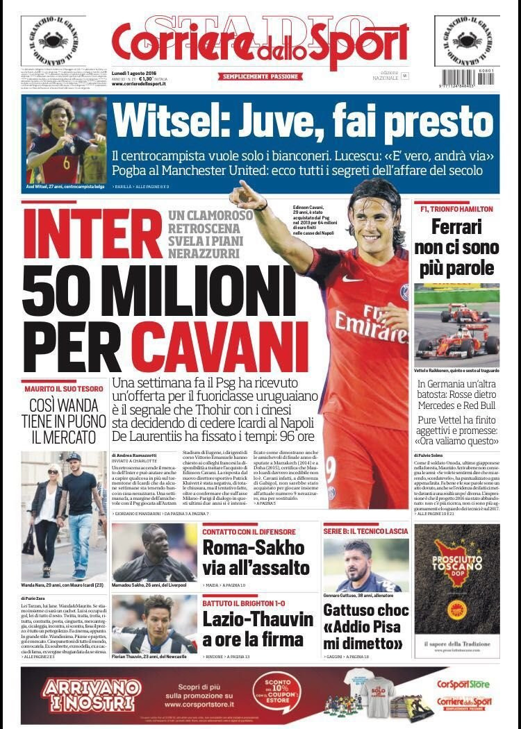 “Inter, 50 milioni per Cavani” titola in prima pagina il Corriere dello Sport, con i nerazzurri che una settimana fa avrebbero fatto la prima offerta al PSG per l’attaccante uruguaiano, chiaro segnale della volontà di vendere Icardi. In altro, l’appello di Witsel alla Juve “fai presto”, con Lucescu che conferma l’addio del belga allo Zenit.