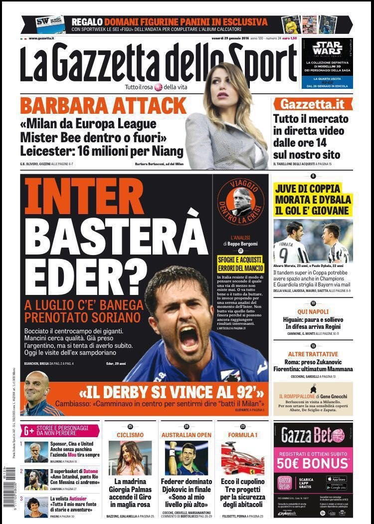 “Inter basterà Eder?” è l’apertura de La Gazzetta dello Sport. Tutto fatto con la Sampdoria, visite mediche dell’attaccante fissate per venerdì mattina. A luglio arriva Banega, prenotato anche Roberto Soriano. In taglio alto, le parole di Barbara Berlusconi: “Milan da Europa League”. E su Niang piomba il Leicester di Claudio Ranieri, club inglese pronto a offrire 16 milioni di euro.